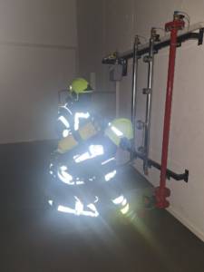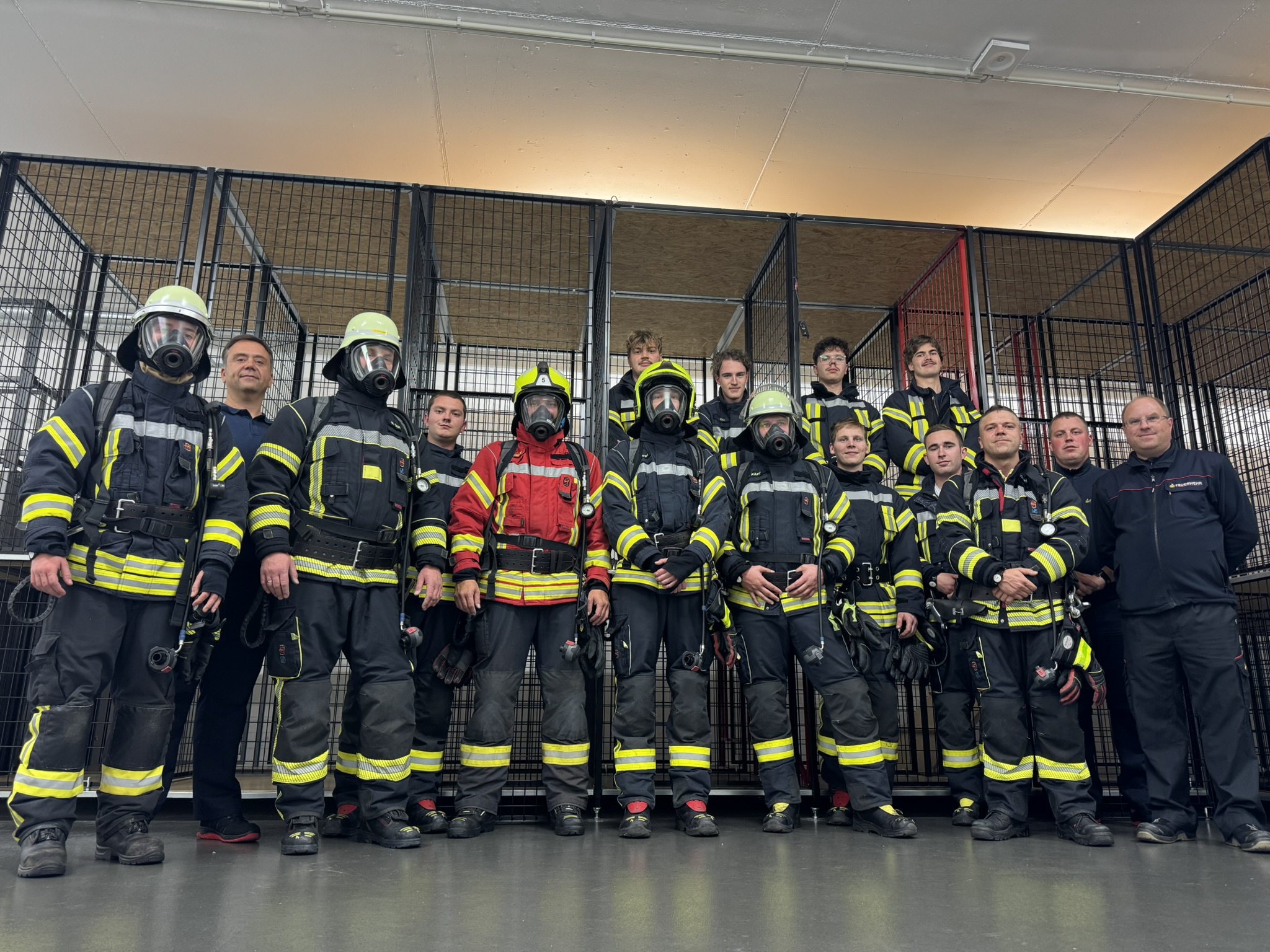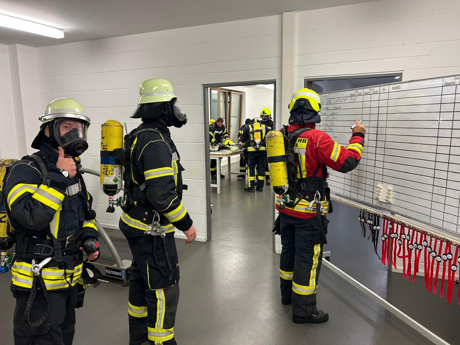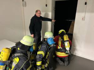Am letzten Lehrgangstag standen die Prüfungen im Mittelpunkt. Zunächst wurden die theoretischen Kenntnisse in einem Multiple-Choice-Fragebogen (25 Fragen) abgeprüft. Danach folgte die praktische Prüfung: Die Atemschutzausrüstung musste in 120 Sekunden sicher angelegt werden, anschließend ging es aufs Steigen der Steckleiter und das Einsteigen in ein Fenster. Danach erhielten die Trupps verschiedene Einsatzaufträge, die sie unter Nullsicht in der Übungsstrecke erfolgreich abarbeiten mussten. Alle 13 Teilnehmer bestanden die Lehrgangsinhalte und die Prüfungen, sodass die Ausbilder ihnen herzlich zur erfolgreich abgelegten Atemschutzgeräteträgerprüfung gratulieren konnten.