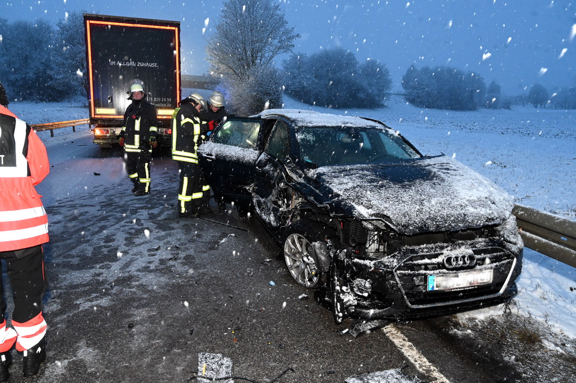 Die winterlichen Straßenverhältnisse und Schneetreiben wurden am Mittwochabend gegen 17Uhr30 einem Audi-Fahrer zum Verhängnis. Auf der Umgehungsstrasse bei Bad Buchau ,von Kanzach in Richtung Bad Schussenried, im Bereich einer der beiden Brücken kam der Audifahrer mit seinem Fahrzeug ins Schleudern und kam dabei auf die Gegenfahrbahn. Der von dort kommende LKW versuchte noch auf die Gegenfahrbahn auszuweichen, konnte aber den Aufprall auf das Führerhaus des Audis nicht mehr verhindern. Der Audi rutschte in Folge zwischen Leitplanke und Aufleger weiter und prallte noch am hinteren Ende gegen den Aufleger. Dabei wurde der Audifahrer verletzt und musste vom Rettungsdienst in das Krankenhaus verbracht werden. Der LKW-Fahrer blieb soweit unverletzt. Am Audi entstand Totalschaden und am LKW und dem Aufleger zusammen wohl in Höhe von einigen zehntausend Euro. Beide Fahrzeuge waren nicht mehr fahrbereit und mussten abgeschleppt werden. Die Feuerwehr Bad Buchau kümmerte sich um auslaufende Betriebsstoffe und um die Reinigung der Fahrbahn, die mit Wrackteilen überseht war.